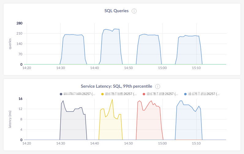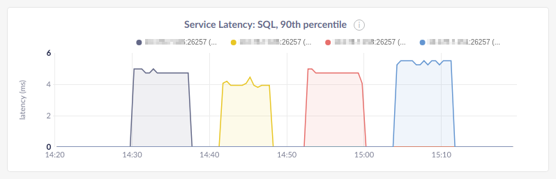 두 번째 그래프는 99%의 질의를 대상으로 하는 Latency를 표시하고 있는데, 위의 그래프와는 달리 이 그래프는 Node별로 다른 색으로 표시되기 때문에 실제로 SQL을 처리한 Node가 어느 Node인지 식별이 가능하다. 오호라! 정말 순서대로, 각각 Client가 직접 접속했던 1, 2, 3, 4번의 Node가 직접 SQL을 처리하고 있음을 알 수 있다.