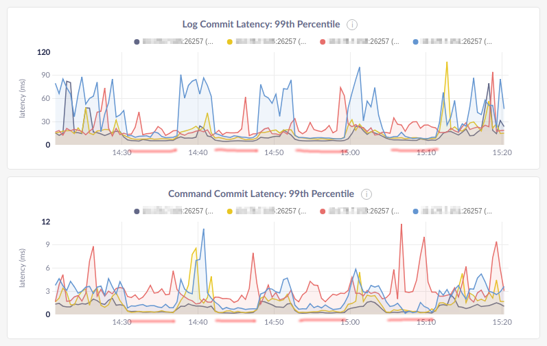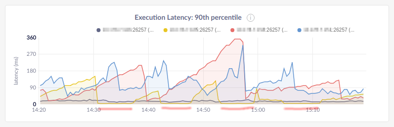 어? 제목을 잘못 달았네? 이거 제대로 된 제목은 “해석할 수 없는 그래프"다. 아래 그래프는 질의를 받고 회답하기까지 걸린 지연시간을 나타내는 Execution Latency인데… 원문 설명은 “The 90th percentile of latency between query requests and responses over a 1 minute period. Values are displayed individually for each node.“라고 되어있다. 그런데 여기서 “query requests"는 뭐지? 그리고 밑줄을 그어둔 것 처럼, 요청이 처리되는 동안 2번 Node는 응답 속도가 빨라진다. 그리고 나머지는 산을 그리는데… 응답 지연이 0.3초나 있다고? 그리고 이들은 실제 작업에 따른 경향성이 없다! 이건 좀 알아볼 문제.