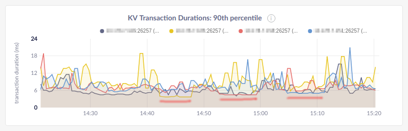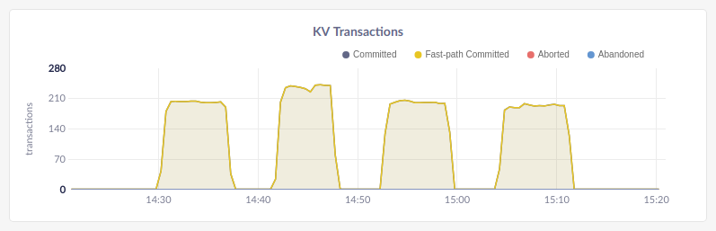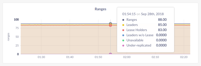 시험 과정 동안 Range의 수는 일정하게 유지되는 반면, Leaseholder의 수가 작은 값이나마 요동치는 것을 볼 수 있었다. 그 외에도, Leaders, Leaders without Lease 등의 지표가 보이는데, 이건 Raft에 의해 Lease가 이동하는 모습에 대해 조금 더 살펴봐야 완전한 이해가 가능할 것으로 생각한다.