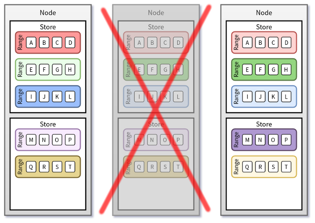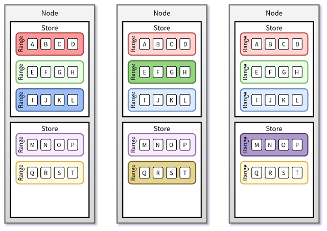 위의 그림은 각각 두 개의 Store를 거느린 세 개의 Node로 구성된 Cluster를 표현한 것인데, 각 Node의 입장에서는 각각 다섯 개의 Range를 담고 있는 형태다.