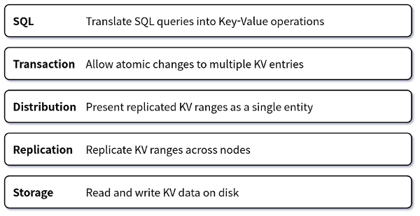 CockroachDB는 기능적으로, 다음의 다섯 계층으로 이루어져 있다.