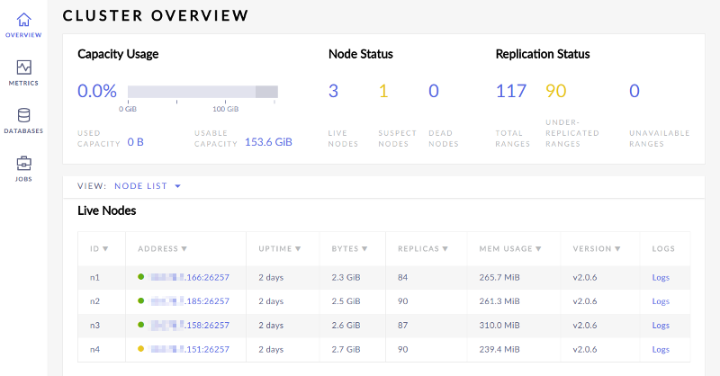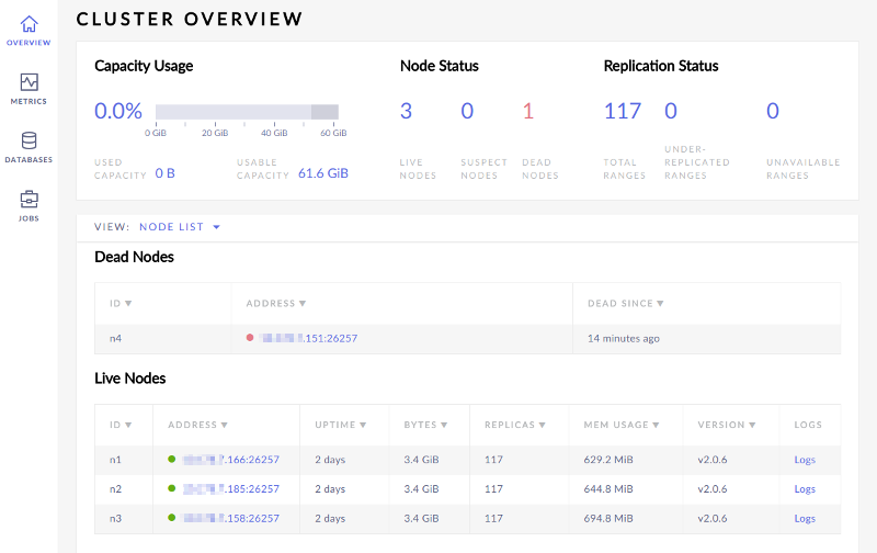 “CockroachDB 클러스터 구성하기“에서 만들어둔 세 대의 클러스터에 한 대를 더 더한 네 개의 Node로 구성된 클러스터에 데이터를 조금 부어 넣었고, (이 과정은 “CockroachDB Architecture“에서 다뤘다.) 이 상태에서 Node 하나를 강제로 죽여봤다. 그리고 CockroachDB가 기본적으로 제공하는 모니터링 화면을 통해 동작 상태를 확인하고, 동시에 CLI Client로 접속해서 정상적으로 사용할 수 있는지 확인했다. (CLI 시험은 꼭 필요한 경우가 아니면 설명을 생략했으며, 생략된 부분은 잘 된다고 보면 된다.)