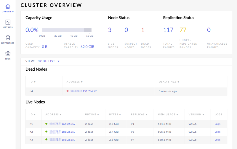별다른 이상한 점 없이, Node 유실에 따른 Cluster의 동작에 대해 확인했다. 이제, 다시 Node가 돌아올 때에 Cockroach가 반응하는 모습을 보자.