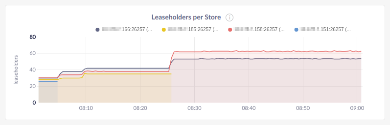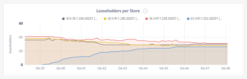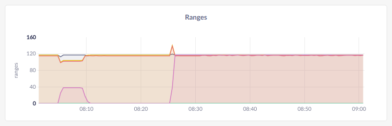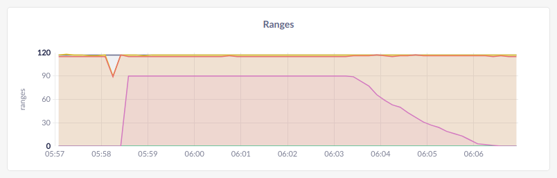 뒤에 깔려있는 진한 파란색 선은 전체 Range의 수량이고, 잠깐 내려왔다가 다시 올라가는 빨간 선은 Leaseholder의 수량이다. 이 때, Node가 죽으면서 그 Node가 갖고 있던 Leaseholder 갯수가 순간(?)적으로 합계에서 제외되었을 것이다.