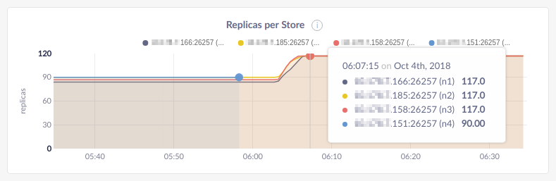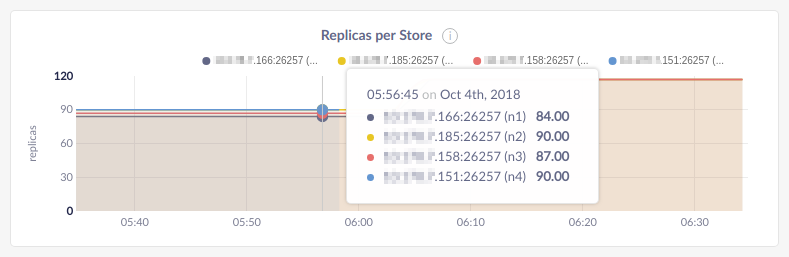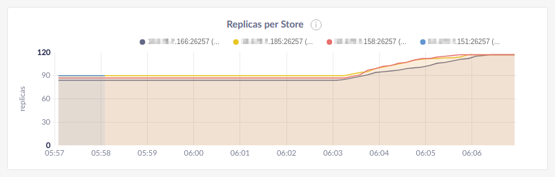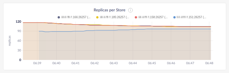 어쨌든 5분이 지나면서 복제 대상이 줄고 있다는 것은 복제가 일어났음을 뜻한다. 아래 그래프는 각 Store 별 Replica의 수를 나타내는데, 현재의 구성은 Node 당 한 개의 Store를 갖도록 구성했으므로 이 수가 바로 Node 별 Replica의 수와 동일하다.