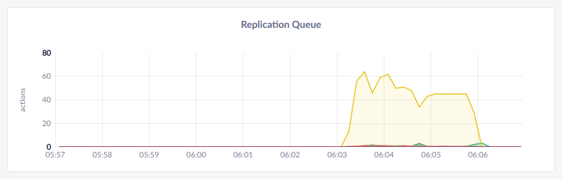 첫 번째 시험과 같이, 복제가 정상적으로 이루어지게 되면, 아래와 같이 노란색 Pending Action 그래프나 Replica를 지웠거나 만든 그래프가 나타나게 되는 것과는 다른 결과다.