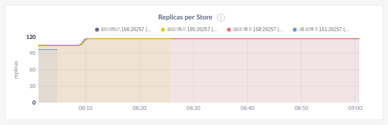 이 시점부터, 모든 Node 들은 동일하게 117개의 Range에 대한 117개의 Replica를 동일하게 보유하고 있었을 것이다. 그리고 다시 15분이 지난 08:25 정도에 두 번째 Node가 사라지면서, 전체 Range가 모두 Replica가 부족한 상태에 빠지게 된다. (Under-replicated의 수가 전체 Range 수와 같다)