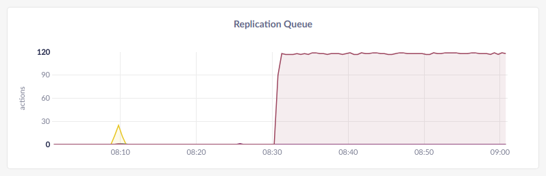 끝끝내 복제는 일어나지 않았다. 위의 그래프를 보면, 08:05 정도에 복제 대상이 40 정도 발생한 것을 보면 이 때 첫 번째 Node가 죽었다는 것과, 08:10이 조금 지나서 Replica의 재배치가 끝났다는 것을 알 수 있다.
