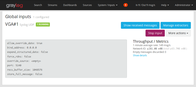둘은 동일한 설정을 갖는데, 그 상세 내용은 위의 Global 구성에서 볼 수 있다. 입력의 유형은 이름 옆에 나와있듯이 Syslog UDP 방식이며, 입력을 받을 포트 등의 설정을 해주게 된다. 실제로 입력이 동작하여 로그가 수집되면 실시간으로 그 유입량을 오른쪽 “Throughput / Metrics” 부분에 표시해줘서 얼마나 바쁘게 움직이는지 바로 확인이 가능하다.