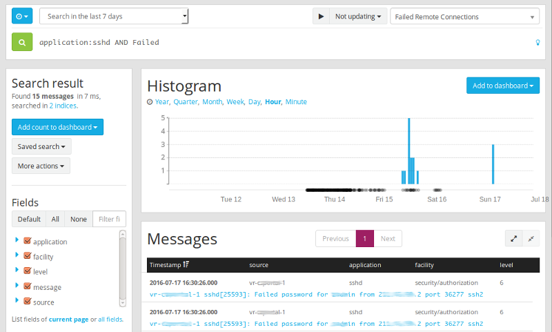 검색줄에 나와있는 질의를 보면 application:sshd AND Failed라고 써있는데,