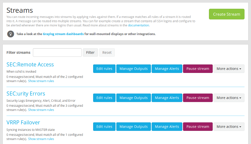 그래서 Graylog가 제공하는 이 기능, Stream에 대해 봐야 한다. 이 스트림을 이용하면, 입력으로 들어오는 로그 중에서 특정 패턴을 만족하는 로그를 별도로 관리할 수 있게 된다.