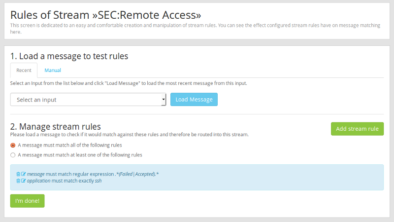 Graylog의 특징 중 하나는, 이러한 설정의 거의 전부가 자체적으로 제공하는 웹기반 인터페이스를 통해 제공되며, 그 사용이 간결하고 편리하도록 구성이 되어있다는 점을 들 수 있다.