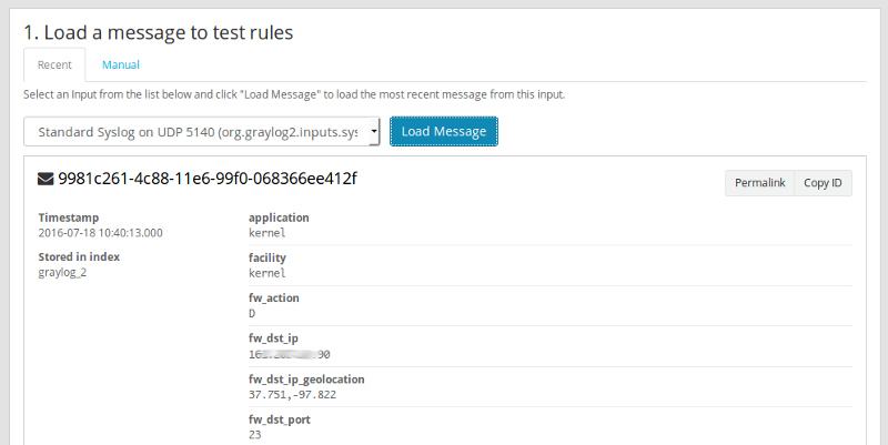 앞서, 입력의 구성을 Syslog UDP 형식으로 했기 때문에, 입력문의 해석을