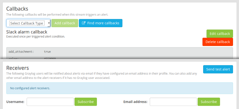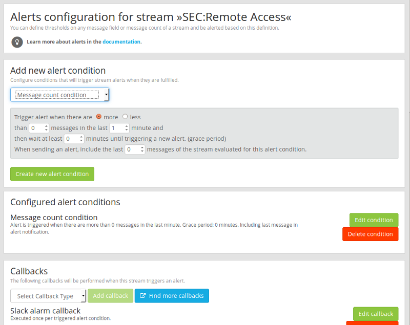 스트림과 그 안의 출력이 만들어졌다면, “이 규칙에 일치하는 로그가 도착했을 때"라는 조건 외에 추가 조건을 붙여 통보 방식을 결정할 수 있다. 실제로, 경보 시스템을 개발하거나 구성해봤다면, 이 부분이 사용성에 있어서 매우 중요한 부분이라는 것을 알 것이다. 그렇지 않으면 사용자는 SPAM을 받게 된다!