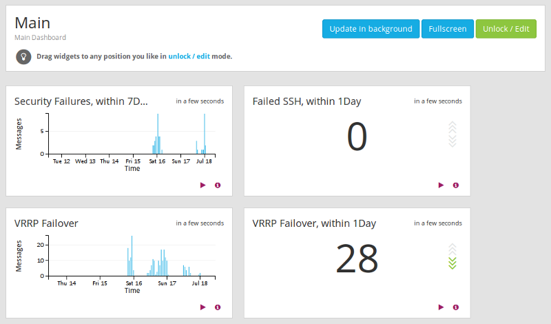 이렇게 로그를 잡아오고 적당히 잘라서 값을 분석해내면, 그것을 이용하여 아래와 같이 시각화할 수 있다. 아래의 예는, 보안 영역에서 실패한 로그의 발생 빈도를 시간축을 기준으로 표시하면서, 그 옆에는 오늘 하루 동안 발생한 SSH 접속 실패 회수를 보여주고 있다. 그리고 그 아래에, 같은 구성을 사용하여 Router의 VRRP 동작 현황을 보여주고 있다.