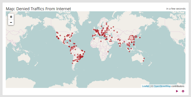방화벽 로그에는 접속을 시도한 IP 정보가 같이 담기게 되는데, 어느 IP가 어떤 지역에 할당된 것인지를 알 수 있도록 제공되는 GeoIP Database를 연동하면 아래와 같이 어느 지역에서 침범(또는 접속)을 시도했는지를 시각적으로 볼 수 있다.