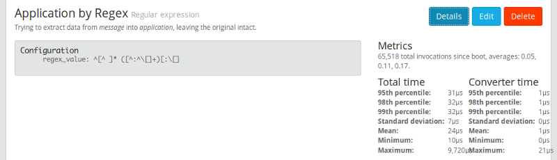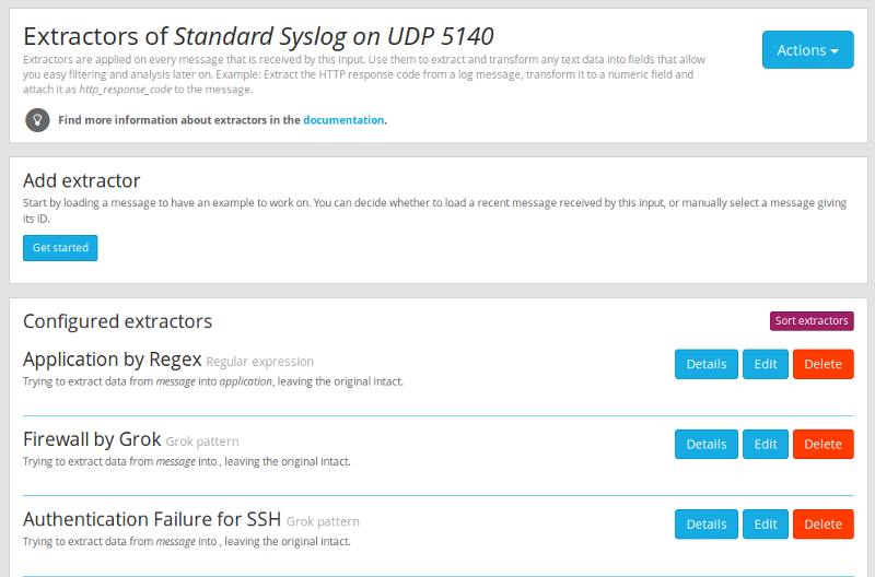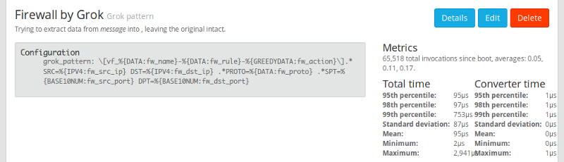 화면의 상단을 보면, 이 Extractor들이 어느 입력에 붙어있는 것들인지 확인이 가능하다. “Standard Syslog on UDP 5140"에 대한 것이라고… 그 아래에는 새로운 Extractor를 작성하기 위한 버튼이 보이고, 그 다음이 이미 구성되어 등록되어 있는 Extractor들이다. 오른쪽의 Details 버튼을 누르면 아래와 같이 보다 자세한 정보를 볼 수 있다.