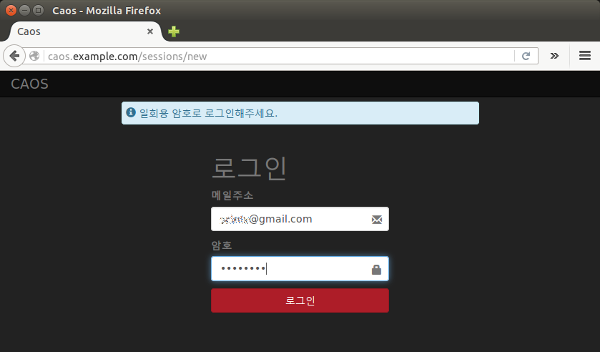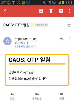 이 일회용 암호는 앞서 입력한 메일주소를 향해서 이미 발송이 된 상태. MUA를 열어보면 아래와 같이 메일이 와 있다. 이제 저 자동생성된 암호를 넣고 로그인을 하면 된다.