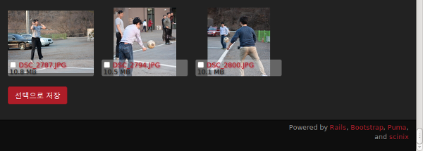 앨범을 구경하다가, 맘에 드는 사진이 있다면 사진 하단의 Checkbox를 선택해주는 과정을 반복하여 주고, 마지막에 맨 아래의 “선택으로 저장” 버튼을 눌러주면 선택된 사진의 묶음이 만들어진다.