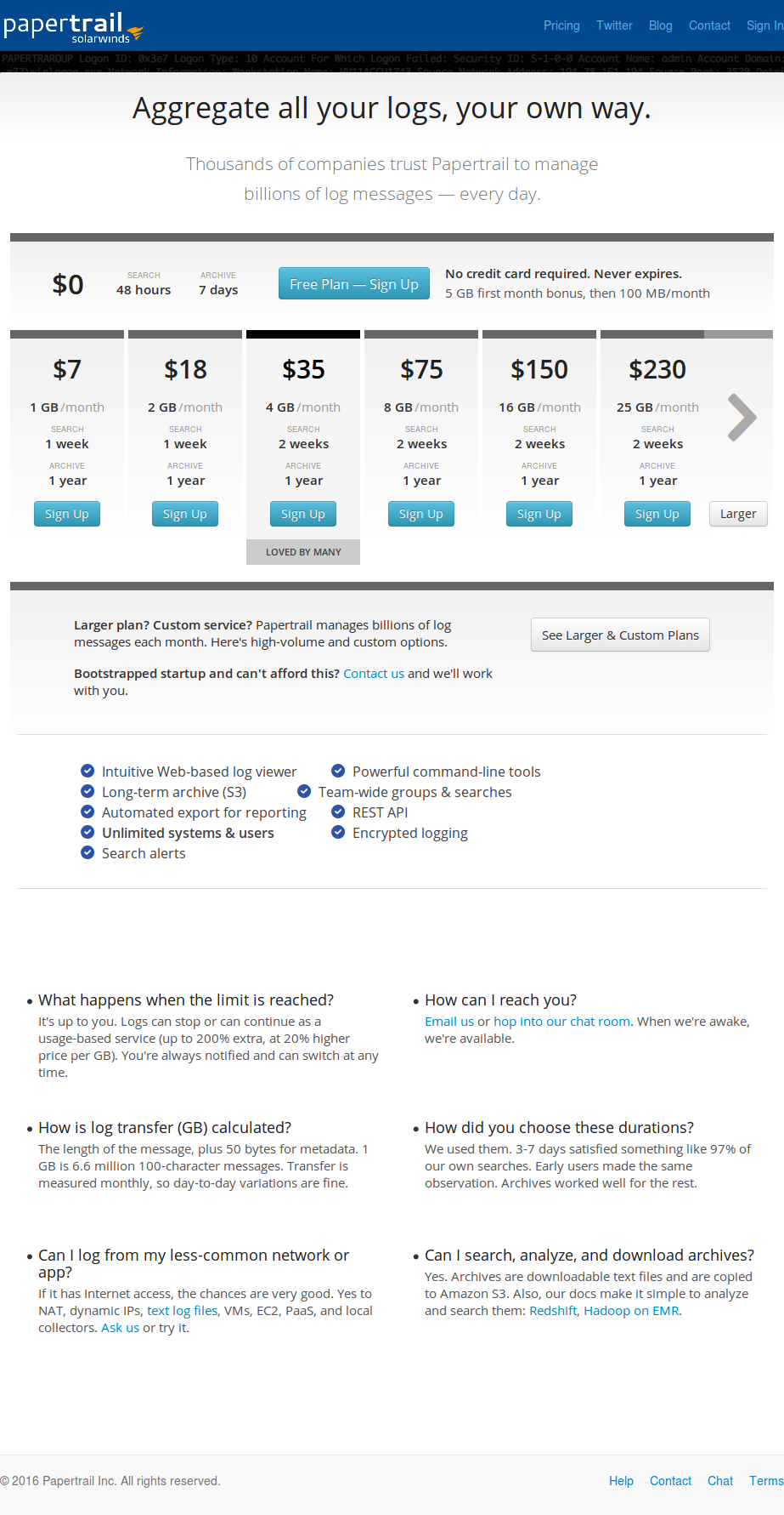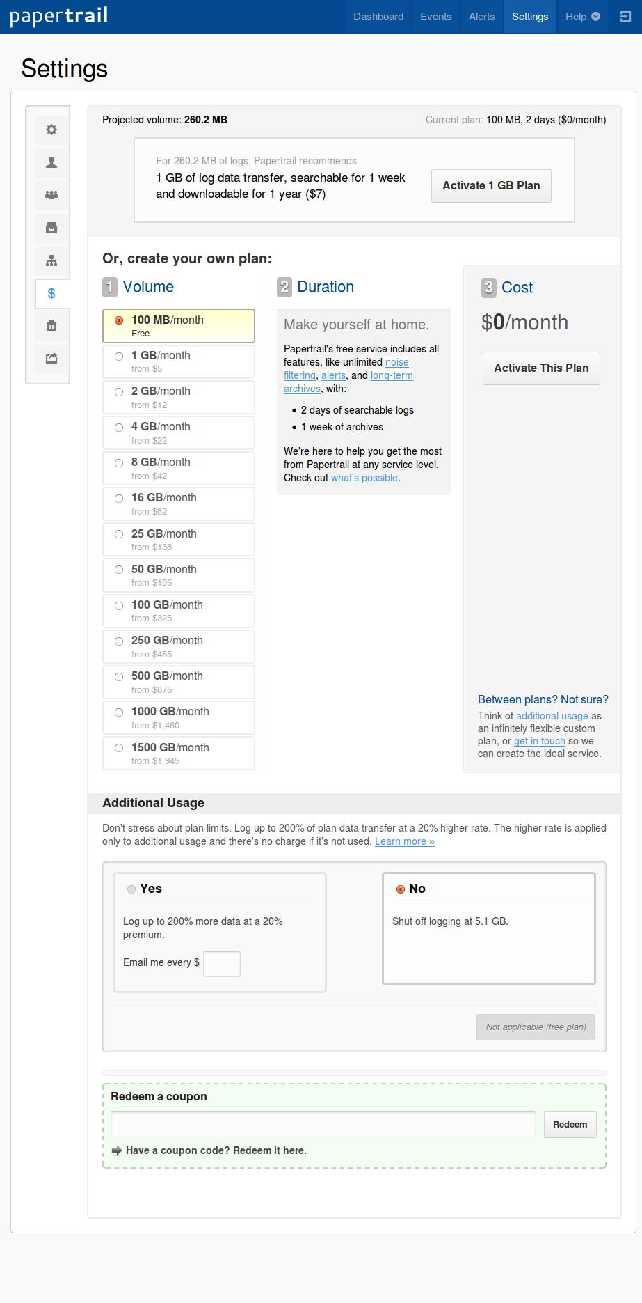 이 서비스는, 아래와 같은 Plan을 갖는데, 나처럼 취미로 서비스를 제공하는 경우를 위해(뭐, 맛들이라는 얘기긴 한데), 7일의 단기 보관과 48시간 내의 자료만 검색이 가능하고 한 달에 100MB 이내의 Traffic만 처리할 수 있는 무료 Plan이 제공된다.