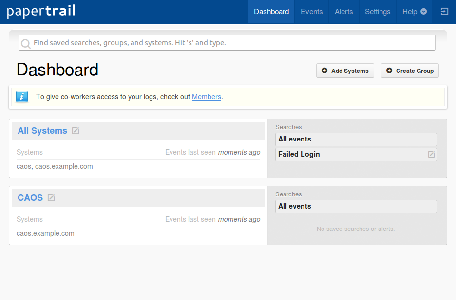 서비스에 가입하고, 설정을 해주면 아래와 같은 Dashboard를 사용할 수 있다. 등록한 시스템의 목록과 각각에 대한 저장된 검색조건이 표시된다.