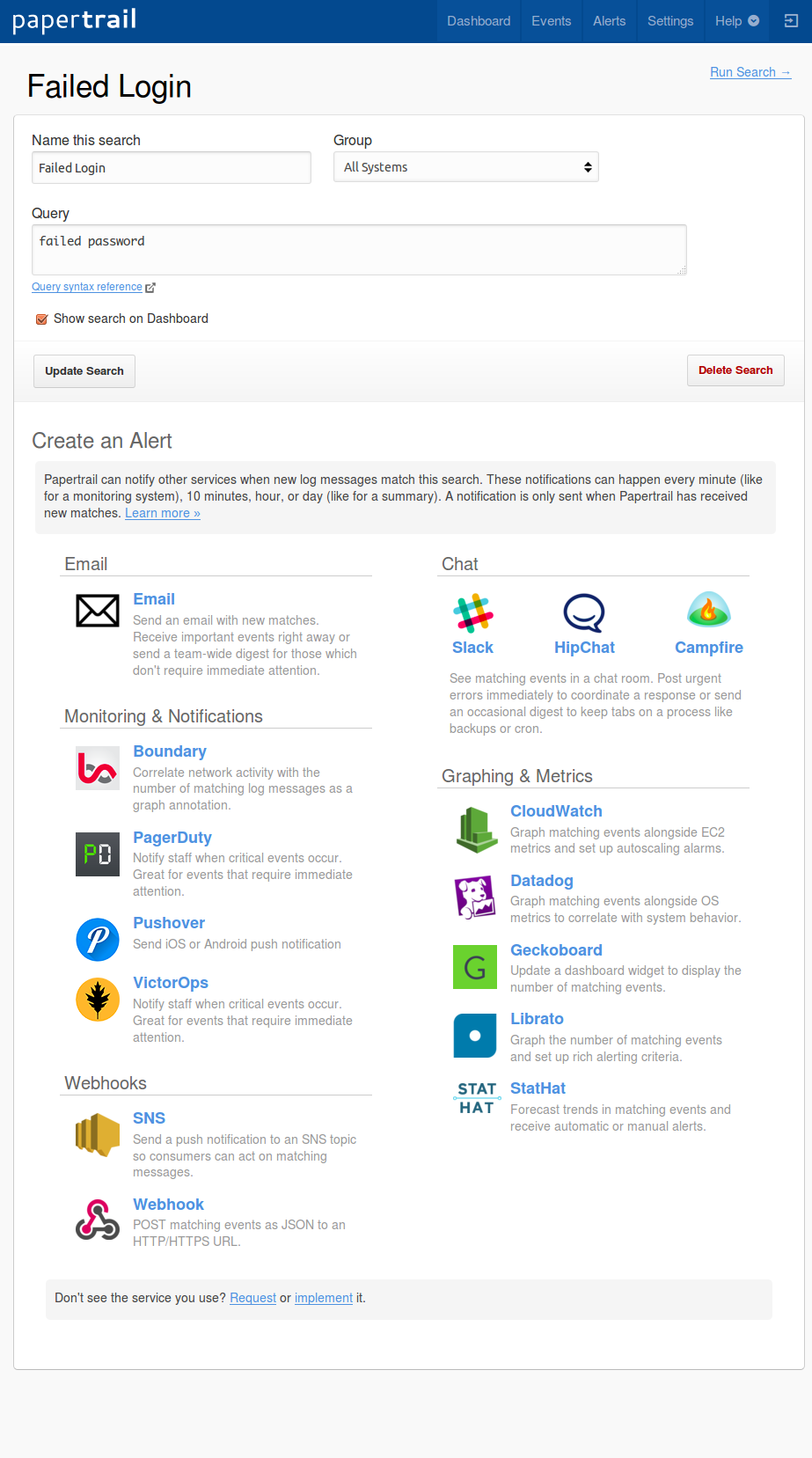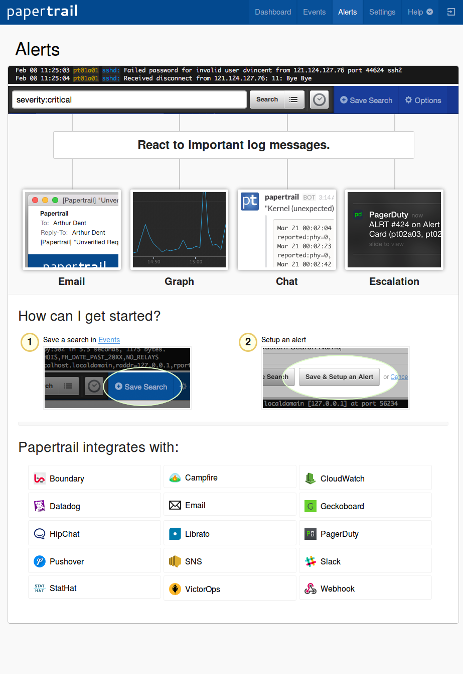 Papertrail은 실시간으로 로그를 추적하면서, 미리 정의할 수 있는 다양한 방식으로 관리자에게 알람을 주는 기능을 제공한다. 아래 도식으로 표현한 것과 같이, Email이나 Chat으로 알림을 주기도 하고, PagerDuty같은 별도의 서비스를 연계하여 문제가 발생했음을 전달하기도 한다.