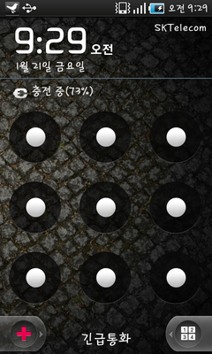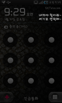 그런데, 이게… 화면이 잠기게 되면 같은 배경 그림을 보여주고 그 위에 블렌딩된 모습으로 잠금패턴 입력이 가능한 화면을 보여준다. 여기서 좀 아쉬운 부분이… “사용자 설정에 의한 개인정보 표기"가 불가능하다는 점이다. 일단 화면을 보면,