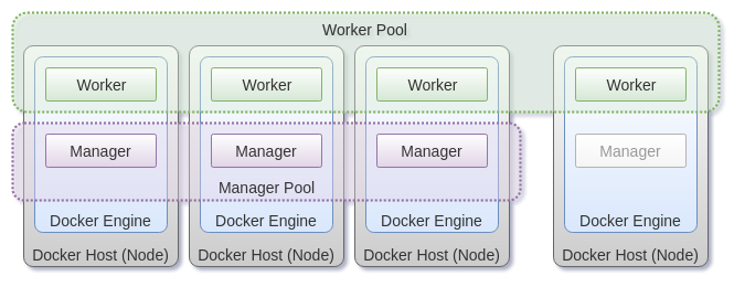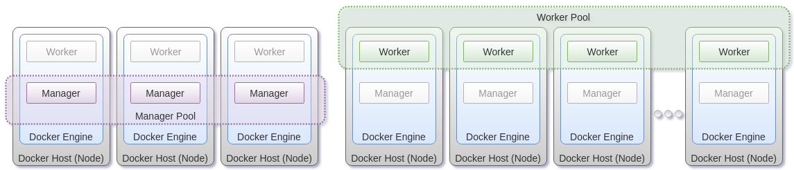 만약, 대규모의 Swarm 클러스터를 계획하고 있다면 Manager와 Worker를 구분하여 구성하는 것이 가능하다. 예를 들어, 30 여 대의 Worker와 3~5 대의 Manager를 독립적인 기계 위에 구성하는 것이다.