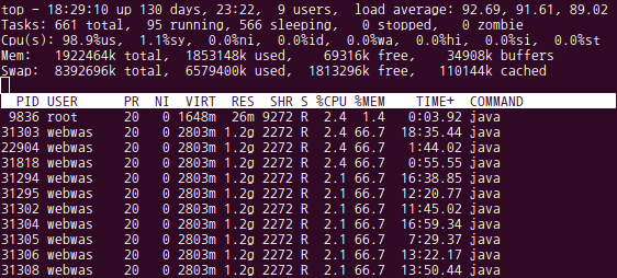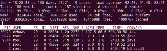 30923번 java 프로세스의 CPU 사용률이 197%, 즉 혼자 CPU 두 개를 다 쓰고 있다.