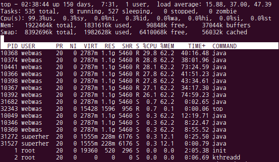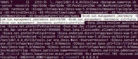 위와 같이, JMX Remote 설정을 하였으며, 서버 내부 방화벽을 믿고 별도의 인증 설정이나 SSL 설정 등은 하지 않는 것으로 하였다.1 그리고 정확히 20일 후, 무슨 약속이라도 한 듯이 시스템 기동 150일째 되던 날, 동일한 상황이 재현 되었다.