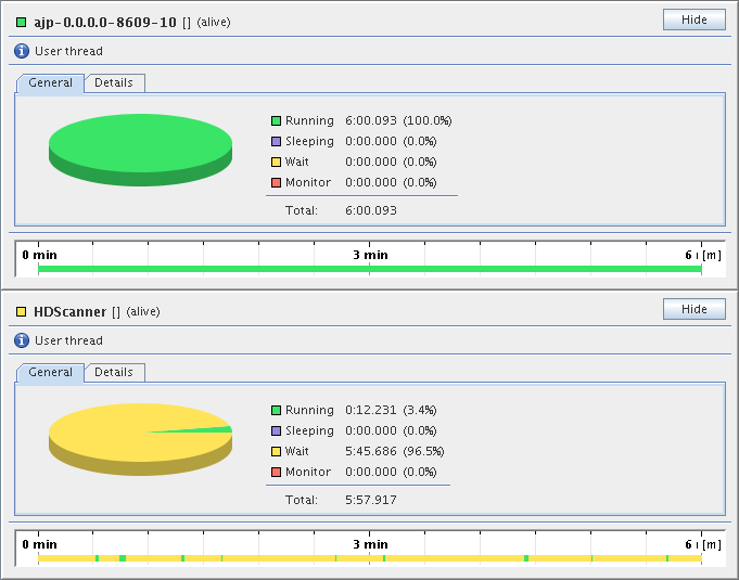 조금 더 자세히, 하나의 Thread(ajp-0.0.0.0-10)를 찍어서 보니 다음의 Timeline 그래프와 같이 “거의 안 쉬고 일하는 것"이 아니라, “6분째 계속 달리고 있었던 것"이다. (6분은 JMX 연결을 통해 보여진 시간이며, 전체 살아온 시간은 아니다.)