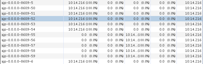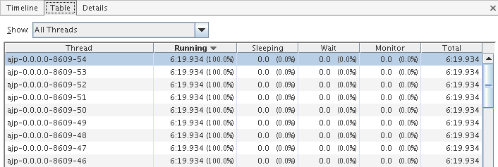 아래의 테이블에서 볼 수 있듯이, 상당수의 Thread가 자신이 살아있는 기간의 전체를 Running 상태에서 보내고 있다. 정상적인 경우라면, 그 비중이 얼마든, 쉬어가면서 일할 텐데…