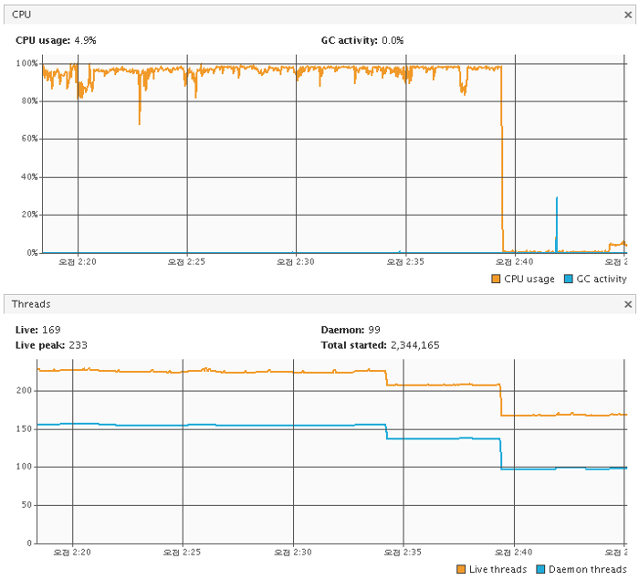 그리고 02:20, 02:38 정도에 CPU 사용량이 흔들리는 것을 볼 수 있고, 02:34, 02:39 정도에는 활성 Thread 수치가 뚝, 뚝. 떨어지는 것을 볼 수 있다. 최종적으로 폭주 Thread가 사라지면서, CPU 사용량은 02:39 정도에 정상치를 회복했다.