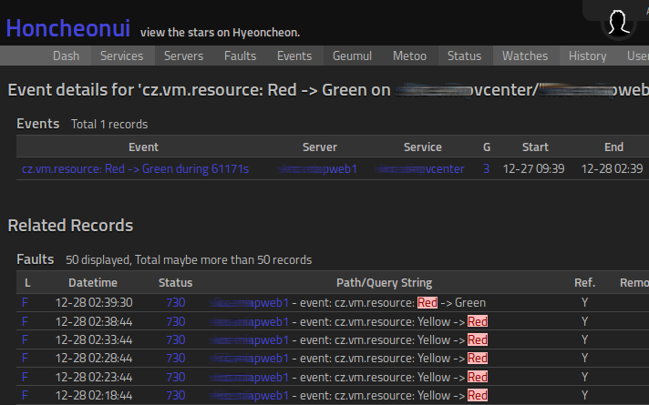 이 장애는 혼천의의 VM 리소스 사용량 감시와 WAS 50X 오류 감지 기능을 이용하여 포착하였다. VM 밖에서 든, 안에서 든 CPU라는 리소스의 폭주를 잡는 것은 쉽게 가능하다. 그러나, 이러한 폭주의 원인 파악으로 이어가고, 그에 대한 자동 대응을 위해서는 WAS의 Response를 감지하는 것이 자동화의 시작점이 될 수 있는 중요한 요소이다.