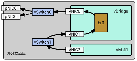 이제 VM #1에서 발생한 패킷은 vSwitch1을 거쳐 vBridge로 향하게 되며, vBridge 안에서는 vNIC1으로 들어와 br0를 거쳐 vNIC0로 빠지는 구조가 완성된다. (반대의 경우도 동일하다.)