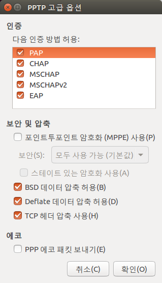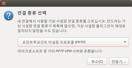 여기서 “추가” 단추를 눌러주면, 아래와 같이 어떤 연결을 만들지 결정하는 대화상자가 나타나게 된다. 물론, 해당 Client 설정을 지원하는 패키지가 미리 설치되어 있어야 하지만, 아래와 같이 “포인트투포인트 터널링 프로토콜“을 선택해준다.