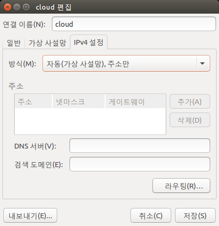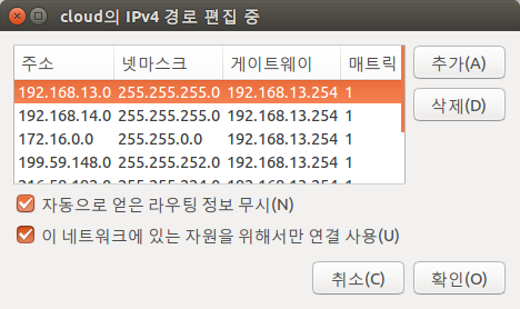 이런 내용을 세부적으로 설정할 수 있도록, Ubuntu의 VPN 접속 도구는 별도 옵션을 제공하고 있다. 아래 그림은 VPN 설정의 “IPv4설정“에 위치한 “라우팅” 단추를 눌렀을 때 만나게 되는 대화상자인데,