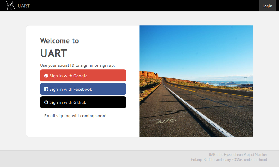현재버전에서 시스템에 접속하게 되면, 아래와 같이 세 종류의 소셜 인증을 제공하는 로그인 페이지를 보게 된다.