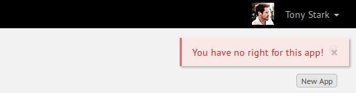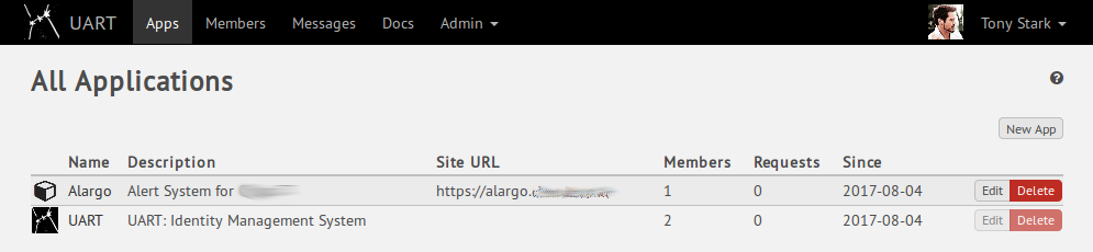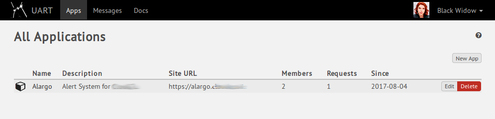 서비스군에 다양한 서비스가 등록된다면 각 서비스는 서로 다른 조직 또는 관리자에 의해 관리되는 경우가 일반적이라고 할 수 있다. 이런 경우, 각 단위 서비스는 각각의 서비스 책임자가 등록 및 관리를 하게 된다. UART에 이러한 앱 관리자 권한을 가진 사용자가 로그인하게 되면, 자신이 관리하는 앱만을 보게 된다. 아래는 Black Widow라는, 앱 관리자 권한을 가진 사용자가 동일한 메뉴에 접속했을 때의 화면이다.