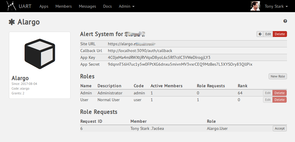 거의 모든 서비스는 관리자와 사용자의 구분이 있을 것이다. UART는 기본으로 admin이라는 코드를 갖는 관리자 역할과 user라는 코드를 갖는 사용자 역할을 기본으로 등록하게 되며, 이 두 역할은 수정이나 삭제가 불가능하다. 이 외에, 해당 서비스의 특성에 따른 다양한 역할이 필요할 수 있는데, 앱의 관리자는 위의 상세화면에서 “New Role” 버튼을 이용하여 추가해줄 수 있다.