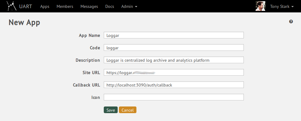 또한, 앱 관리자 권한을 가진 사용자는 새로운 앱을 등록할 수 있는데, 아래와 같이 앱의 이름, 앱을 식별하기 위한 코드, 간단한 설명과 앱이 서비스되는 URL, 그리고 마지막으로 UART를 통해 인증을 할 때 사용할 OAuth2 Callback URL을 등록해주게 된다. Icon 항목은 선택적으로 사용할 수 있는데, 해당 앱을 표시할 때 사용하는 이미지이다.