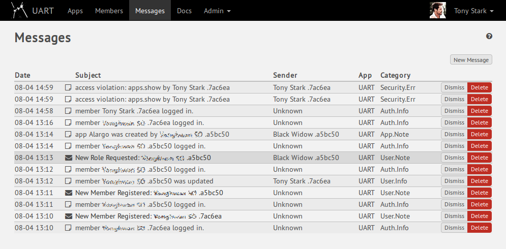 위의 그림과 같이, 관리자 권한을 갖는 Tony Stark는 UART 자체를 포함하여 UART에 등록된 모든 응용서비스의 등록정보를 확인할 수 있다.