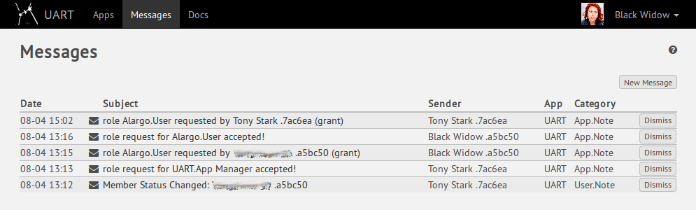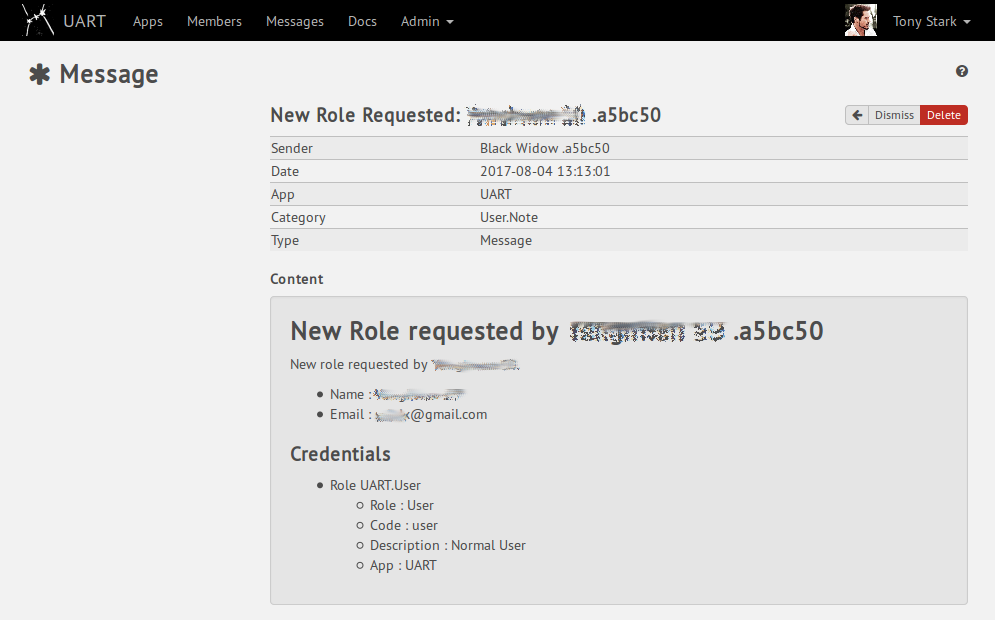 앱 관리자 권한을 갖는 Black Widow에게는 “role … requested by…” 같은 앱에 관련된 메시지가 전달된다. 그 중 하나를 자세히 보면 아래와 같다.