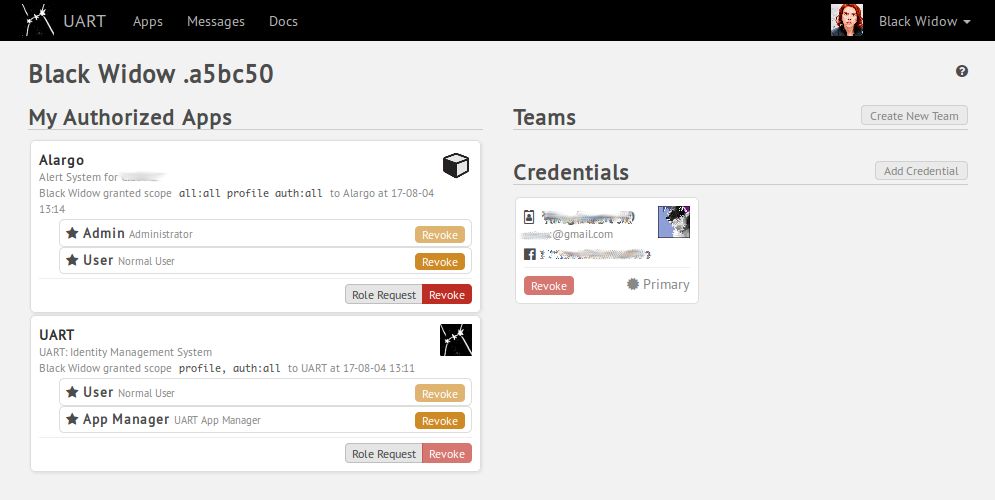 UART에 등록한 사용자가 로그인을 하면 뭐… 볼 게 없다. 그러다가 화면 오른쪽 위에 위치한 자신의 이름을 클릭해서 맴버십 페이지로 이동하면 아래와 같은 화면을 만나게 된다. 이 화면은 나의 UART 사용 현황을 한 눈에 보여주는 것인데, 내가 사용하는(Grant한) 앱의 정보, 그 앱 내에서 허용된 역할에 대한 정보, 그리고 로그인에 사용한 신임정보(Credential)를 확인할 수 있는 것이 전부다.
