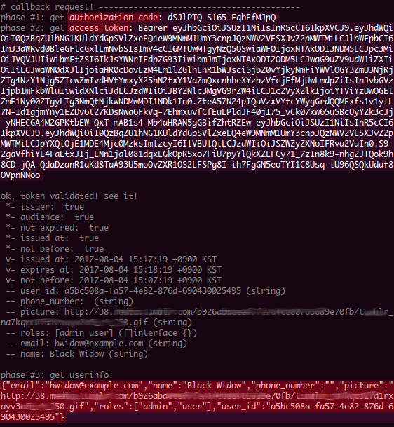 그러나 만약, 사용자의 Client가 JWT를 지원하지 않는다면, 세 번째 Phase로 이동하여 사용자 정보를 사용자 정보서버(UART는 이 역할도 함께 수행하지만 개념적으로는 서로 다른 서버일 수 있다)에게 그 정보를 물어볼 수 있다. 물론, 이 때 Access Token을 사용하게 된다. 위 화면의 마지막 줄은 이렇게 사용자 정보를 물어본 결과를 출력한 것으로, 내용이 그 위의 Token에 포함된 정보와 같은 것을 알 수 있다.