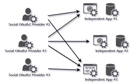 왼쪽에 표시된 사람모양이 사용자 인증을 제공하는 소셜 서비스이고, 오른쪽의 세 개는 각각 독자적인 소셜인증을 사용하는 서비스들이다. 이들은 서로 독립적 서비스지만, 모두 소셜인증을 사용한다는 공통점을 가지고 있다. 그리고 각각은 자신의 고유의 데이터를 담고 있는 사용자 DB를 독자적으로 갖춰야 대부분의 경우, 정상적인 서비스를 제공할 수 있을 것이다.