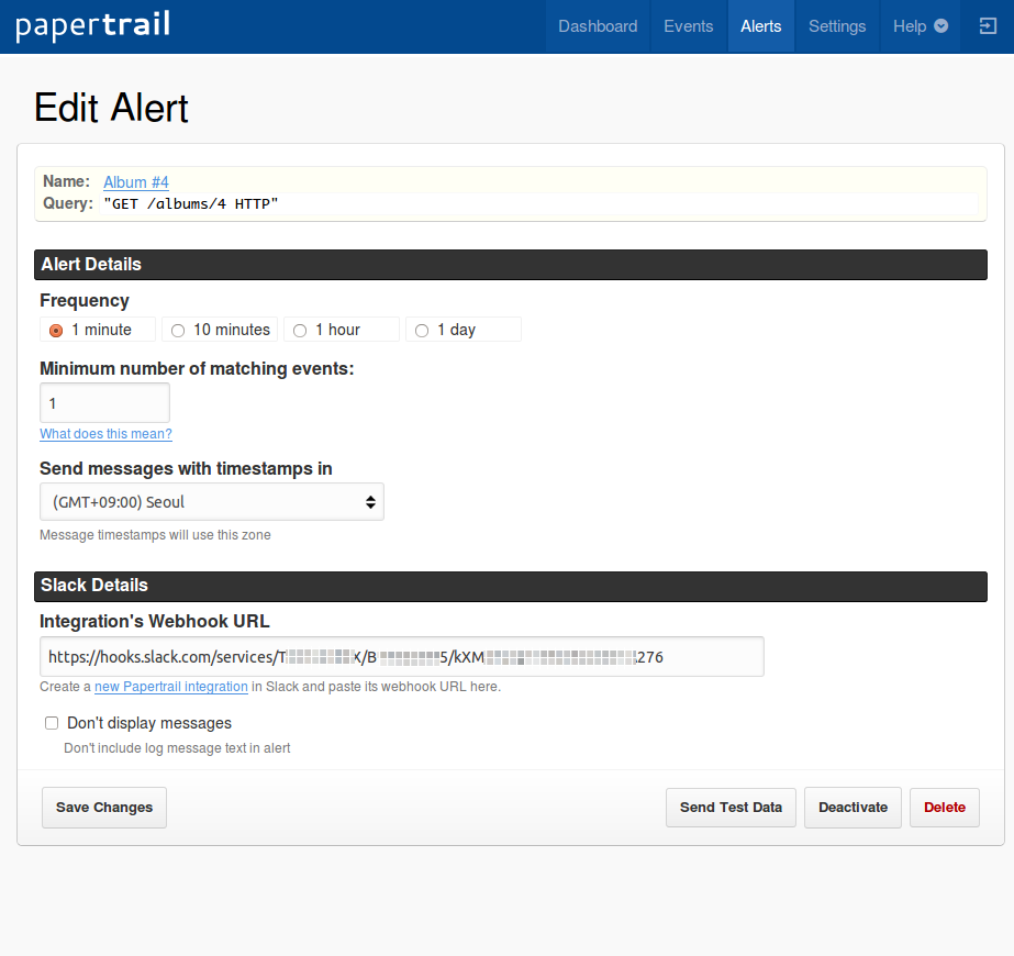 아래의 그림은, “Album #4"라는 이름의 검색(Search)에 Slack 메시지 방식의 경보(Alert)를 붙인 것이다. 경보 상세를 보면, 1회라도 사건이 발생하면 매 1분 간격으로 한국시간 기준의 메시지를 발송하겠다고 정의하고 있다. 또한, Slack에 메시지를 보내는 URL을 정의하고 있다. (이 부분은 좀 더 설명이 필요하지만, 우리의 주제는 아니니까 생략)