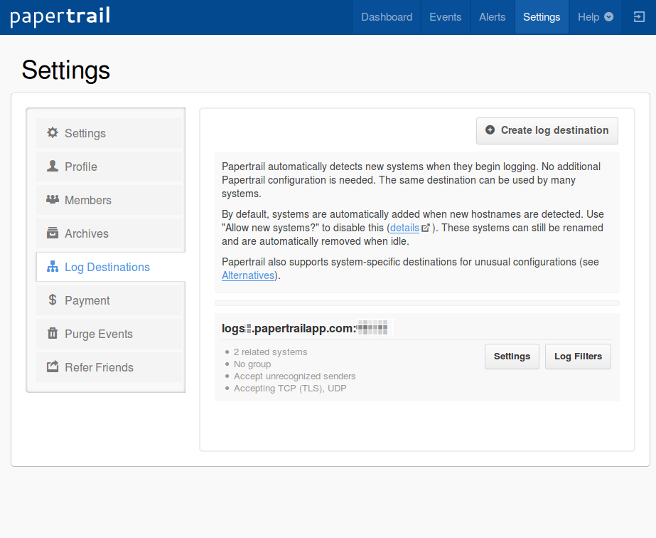 리눅스 시스템에서 널리 쓰이고 있는 rsyslog는 원격지의 syslog 서버에게 로그를 쏘아주는 기능을 가지고 있다. (뭐, syslog는 다 그렇다.) 이제, 어디로 쏴야하는지만 알면 되는데, Papertrail은 다음과 같이 설정페이지의 Log Destinations에서 설정을 할 수 있도록 하고 있다.