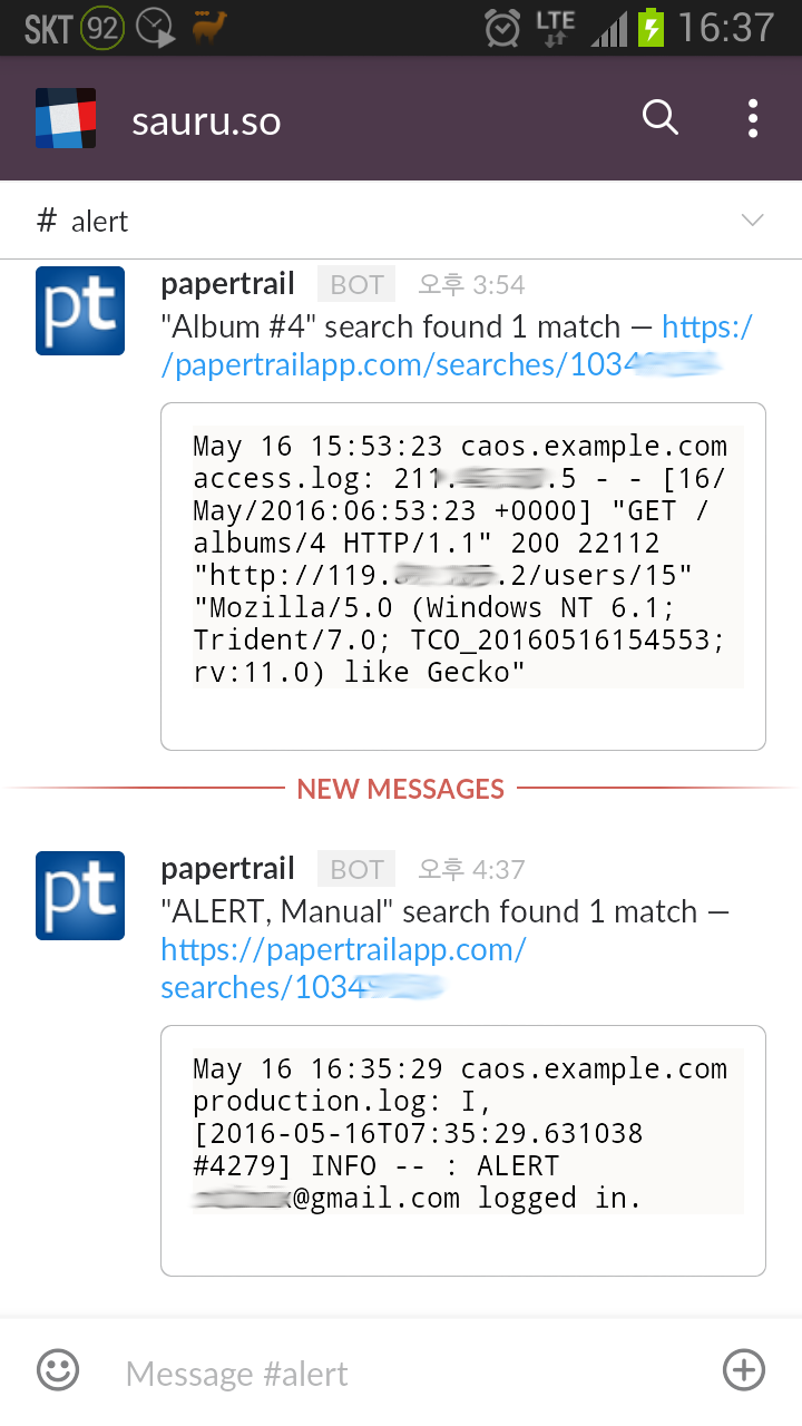 이렇게 두 가지 검색에 대한 경보가 Slack 앱에 수신된 모습이다.