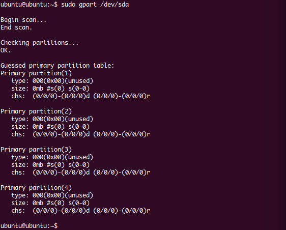 보는 바와 같이, 아무 파티션도 잡아내지 못했다. 이건 지금 시점에서는
